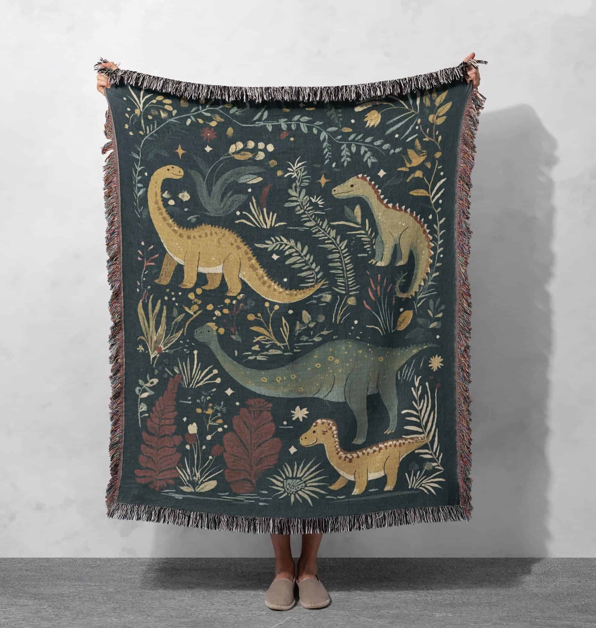 Elevate your home decor with our Dinosaur Woven Blanket – Whimsical Green And Yellow Kids Throw With Prehistoric Theme And Fringe Edges Cottagecore Tapestry.