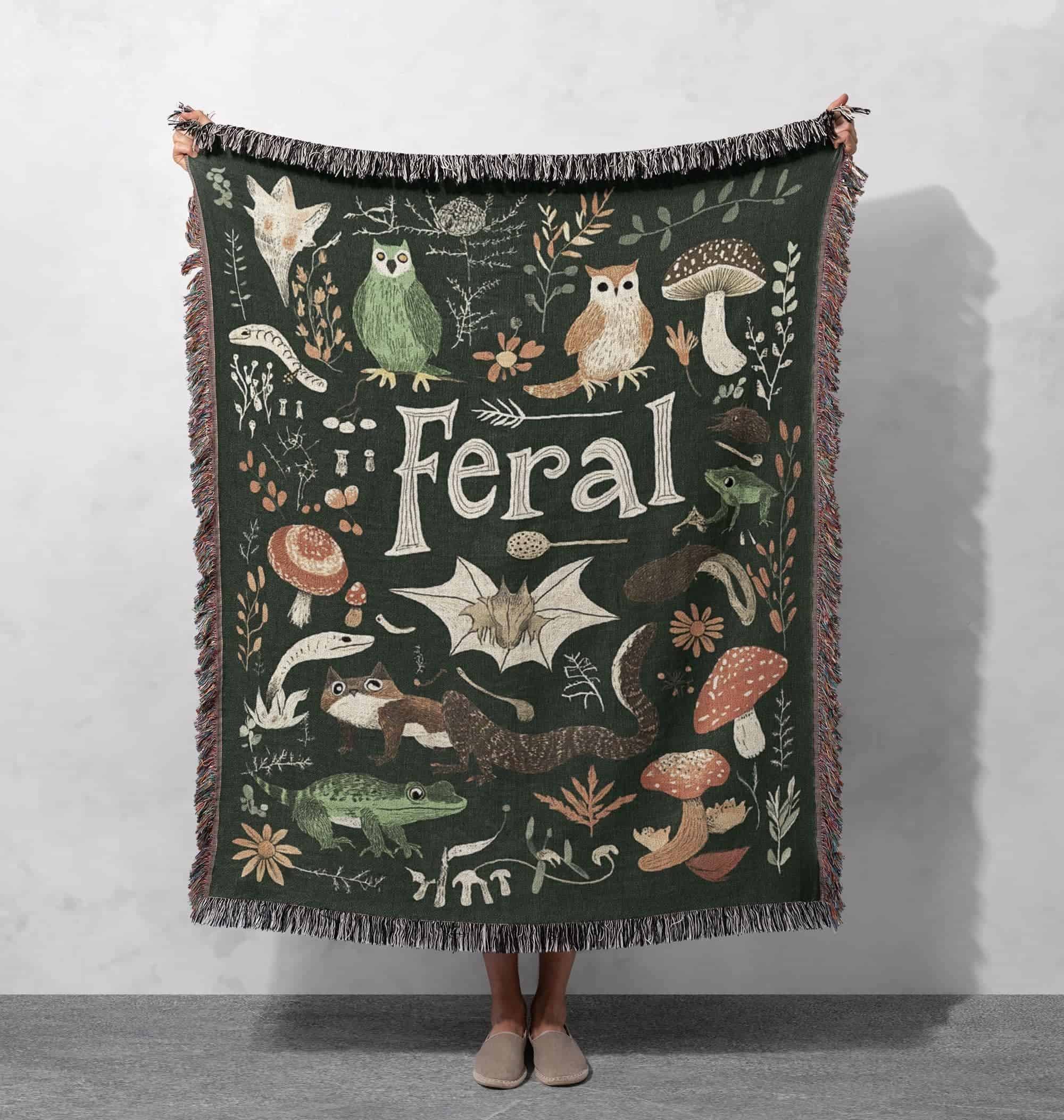 Elevate your home decor with our Feral Animal Woven Blanket With Forest Creatures And Green Background Cottagecore Tapestry.
